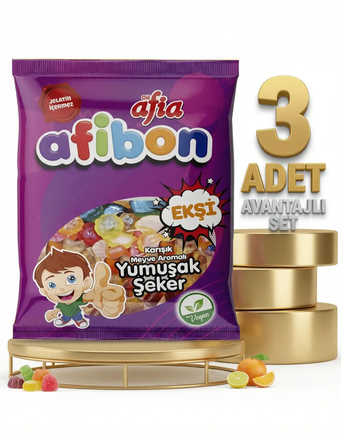 | Paket İçeriği | 3 Adet Afia Afibon Ekşi Karışık Meyveli Yumuşak Şeker 80 Gr |