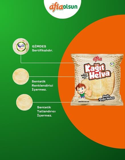 Afia Sade Kağıt Helva, geleneksel yöntemlerle üretilen ince ve hafif yapıya sahip bir tatlıdır. Kendine özgü çıtır dokusu ve sade tadı ile farklı bir tatlı deneyimi sunar. Tek başına tüketilebildiği gibi dondurma ve çeşitli tatlılara eşlik edebilir. Helal sertifikalı olması, kalite ve hijyen açısından tüketicilere güven verir. Pratik ve taşınabilir ambalajıyla her yerde rahatlıkla tüketilebilir.