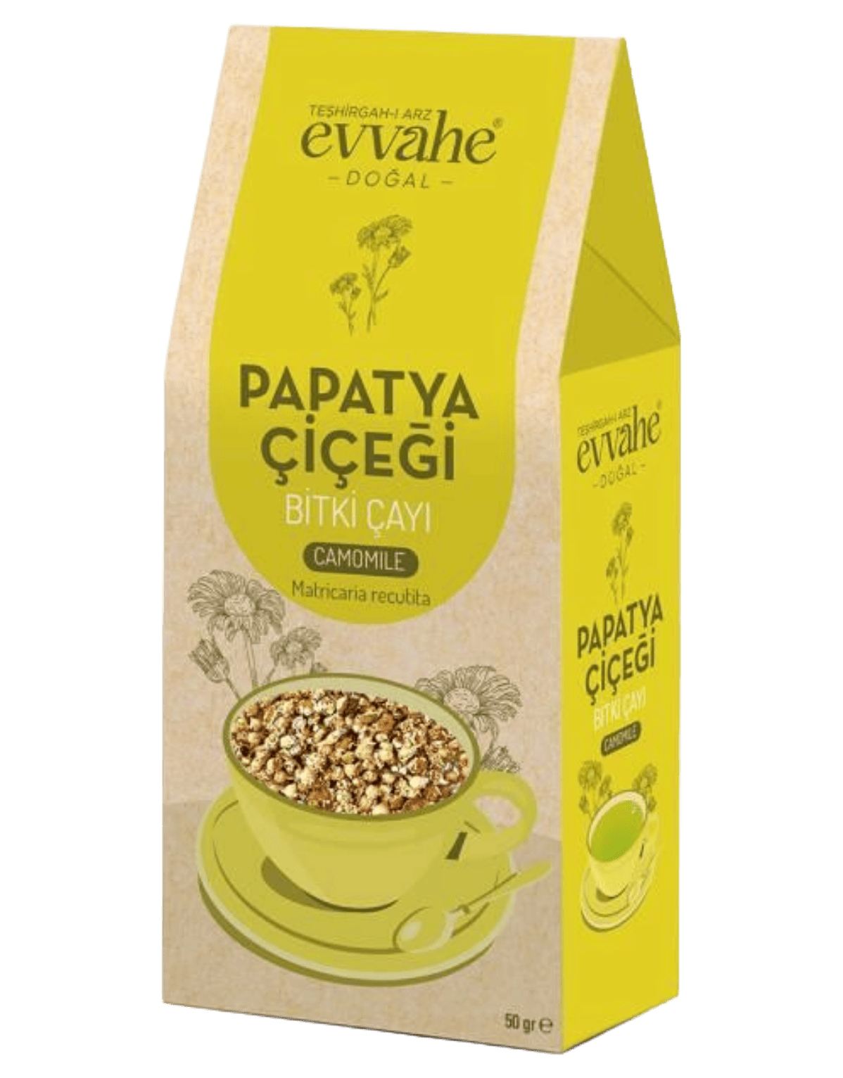 Evvahe Papatya Çiçeği, Matricaria recutita bitkisinin kurutulmuş çiçeklerinden elde edilen doğal ve hoş kokulu bir bitki çayıdır. Türkiye menşelidir ve 50 gram içeriğe sahiptir. Bitkisel takviye olarak kullanılır, özellikle sakinleştirici ve rahatlatıcı etkileri ile bilinir. Serin ve kuru yerde saklanmalı, tavsiye edilen tüketim miktarı ve kullanım şekline uyulmalıdır.
