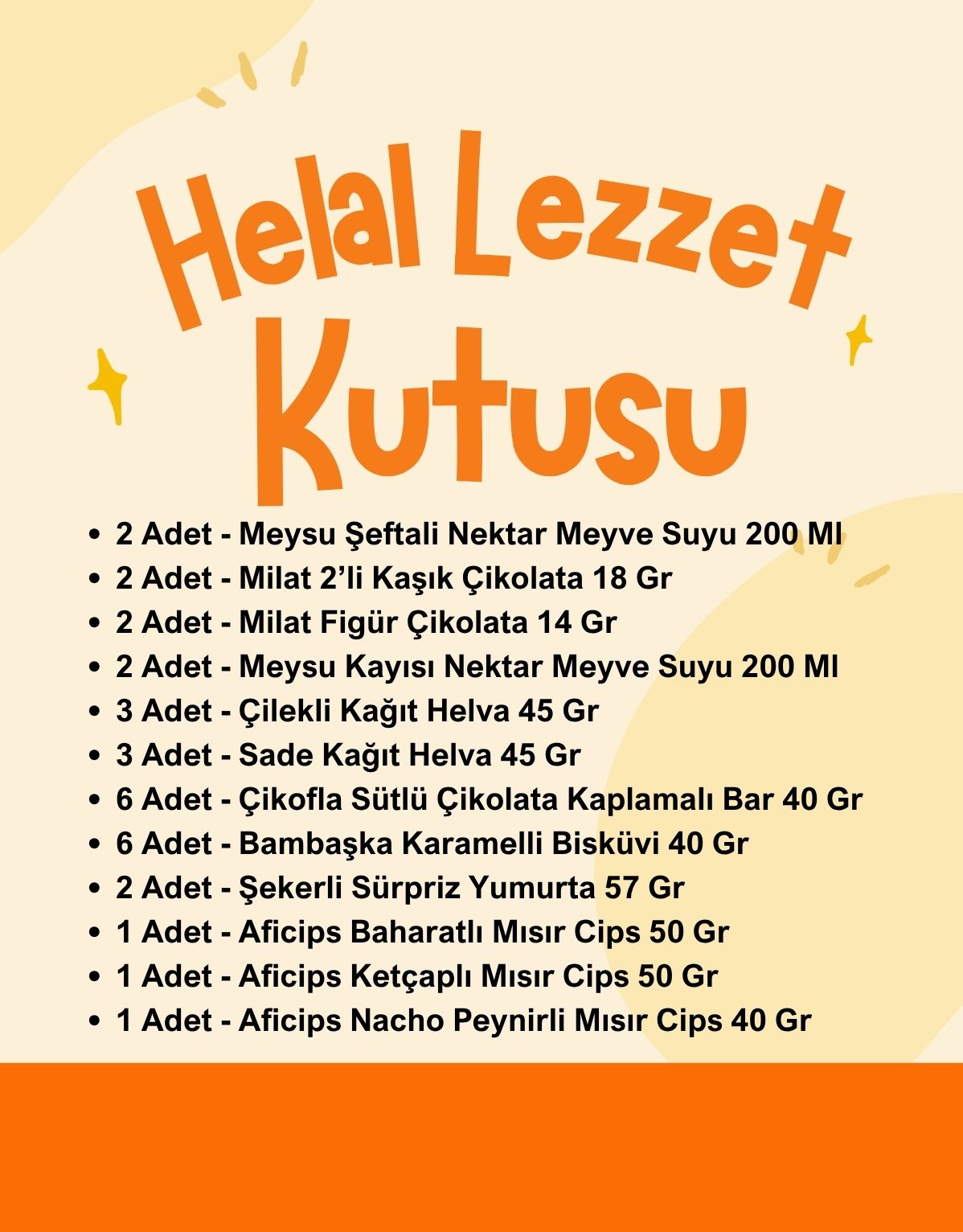 Helal Lezzet Kutusu, her yaşa hitap eden doğal, helal ve güvenilir atıştırmalıklardan oluşan özel bir lezzet paketidir. Çocuklardan yetişkinlere kadar herkesin severek tüketeceği bu kutuda; meyve suları, çikolatalar, helvalar, cipsler ve daha birçok keyifli ürün bir arada sunulur. Günün her anında enerji veren, tatlı ve tuzlu lezzetleri dengeli şekilde barındıran bu kutu, hem sağlıklı hem de keyifli atıştırmalık deneyimi sunar.