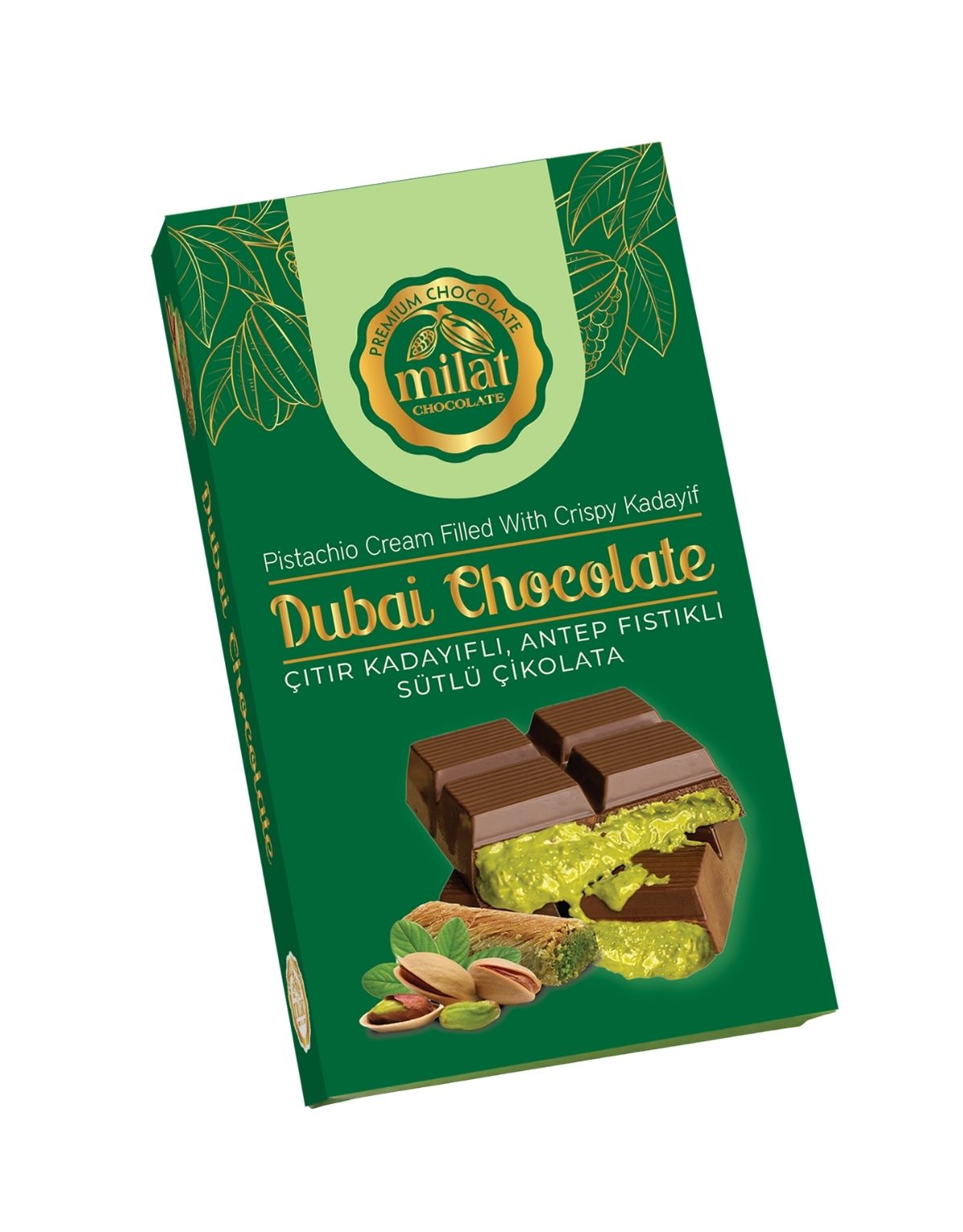 Milat Kadayıflı Dubai Fıstıklı 60 gr, çıtır tel kadayıf katmanı ve Antep fıstığı kreması ile zenginleştirilmiş sütlü çikolata lezzeti sunar. Küçük paket boyutuyla hem atıştırmalık hem hediye olarak ideal.