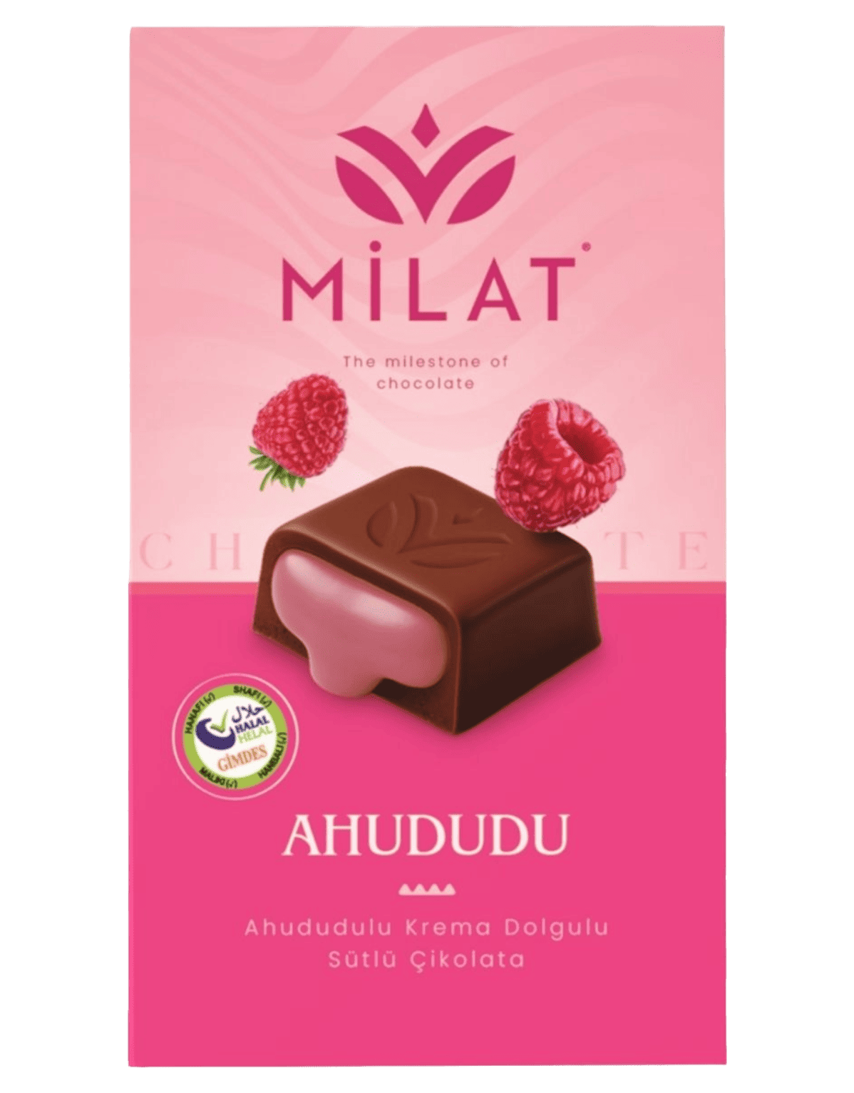 Milat Premium Ahududu Dolgulu Çikolata sütlü çikolata tabanına sahiptir. Yoğun sütlü tat, ahududunun ferah aromasıyla dengelenmiştir.