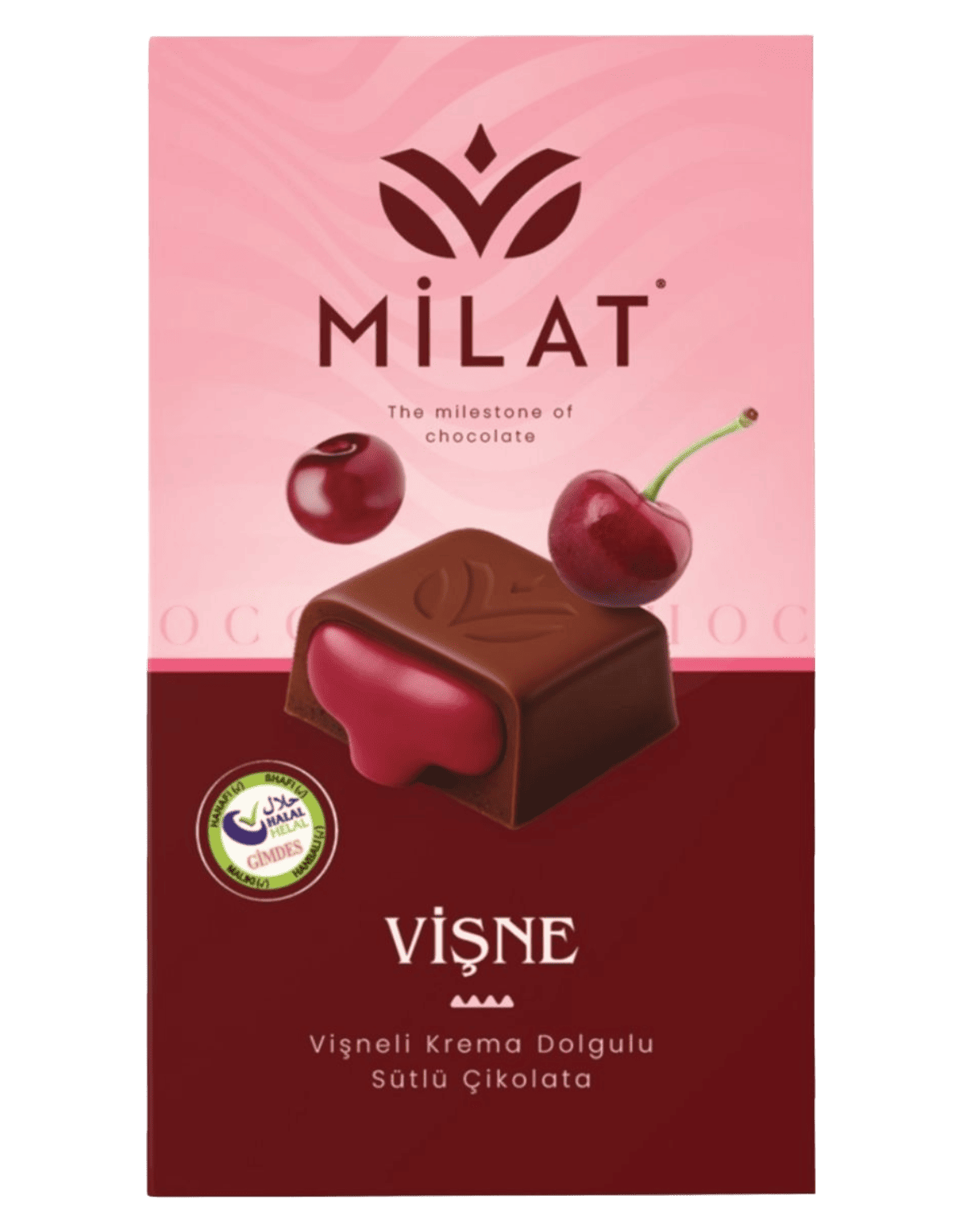 Milat Premıum Vişne Dolgulu Sütlü Çikolata, tatlı ve ekşi aromaları dengeli şekilde birleştiren kaliteli bir sütlü çikolatadır. Pratik ambalajı ve doğal içeriğiyle lezzetli ve güvenilir bir atıştırmalık seçeneği sunar.