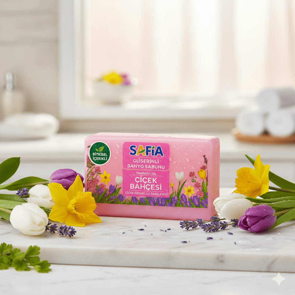 Safia Gliserinli Çiçek Bahcesi Banyo Sabunu 150 Gr; çiçeksi kokusu, gliserin desteği ve nazik temizleme gücüyle banyo zamanını keyifli ve ferah bir cilt bakımına dönüştürmek isteyenler için idealdir.