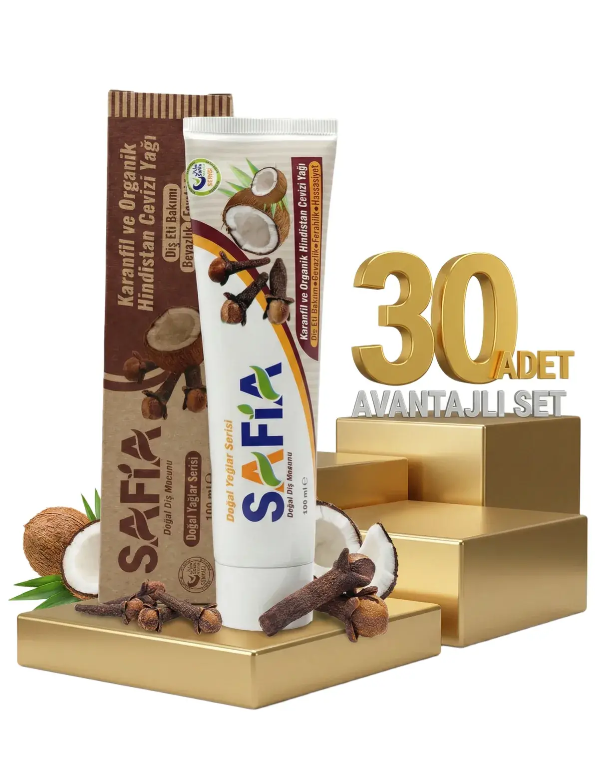 | Paket İçeriği | 30 Adet Safia Karanfil ve Hindistan Cevizli Organik Diş Macunu 100 Ml |