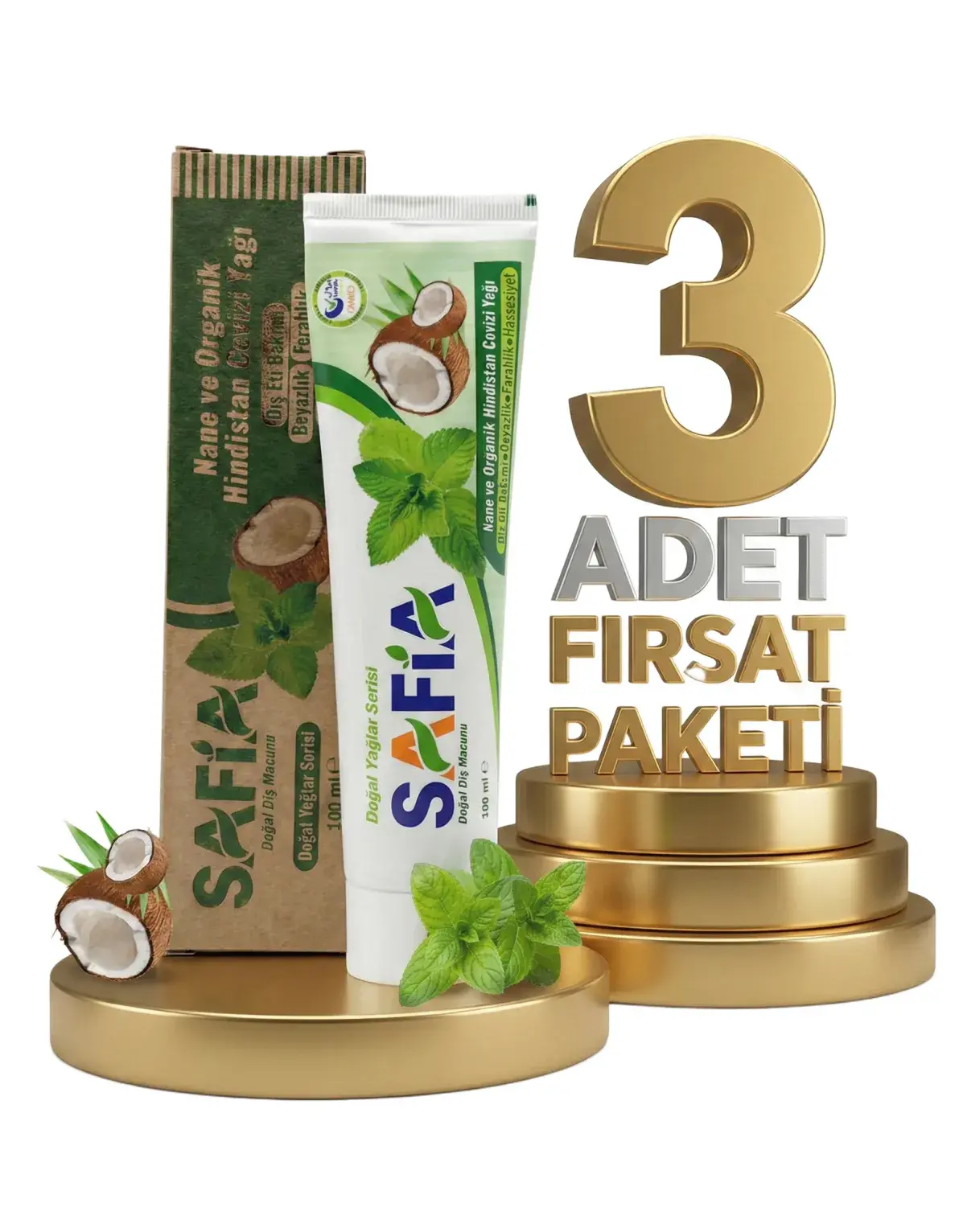 | Paket İçeriği | 3 Adet Safia Nane ve Hindistan Cevizli Organik Diş Macunu 100 Ml |