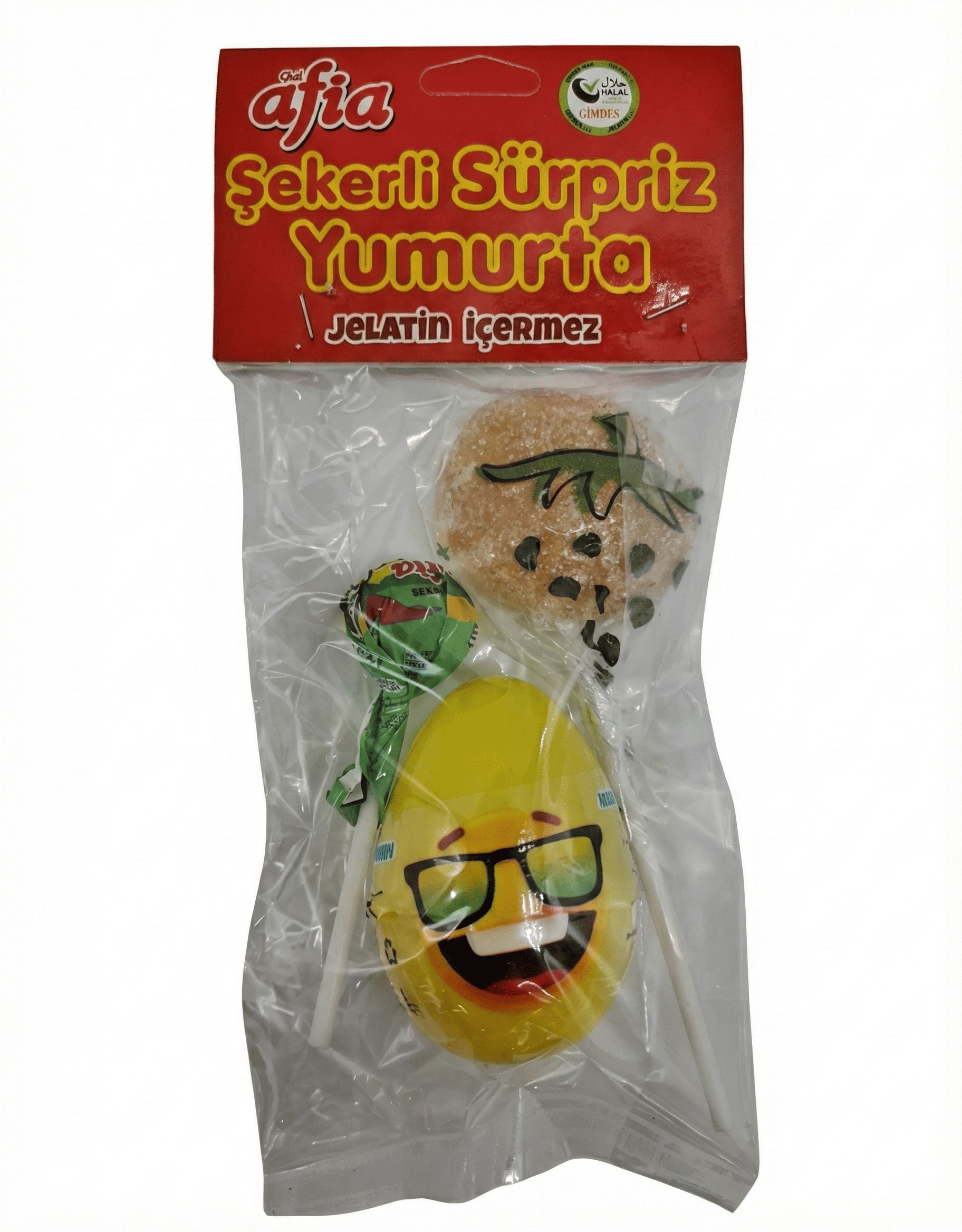 Afia Şekerli Sürpriz Yumurta, çocuklar ve çocuk kalanlar için lezzetli ve eğlenceli bir şeker ürünüdür. İçeriğinde jöle, şeker ve sosyete şeker bulunur, bu birleşim tatlı bir mola ve sürpriz dolu anlar sunar. Ürün, helal sertifikalı, jelatin içermeyen sağlıklı bir alternatif olarak öne çıkar. Yumuşacık jöle tatları ve renkli çeşitlilikle farklı yaş gruplarına hitap eder. Afia tarafından Türkiye'de üretilmekte ve titiz kalite, sağlık ve hijyen standartları ile denetlenmektedir.