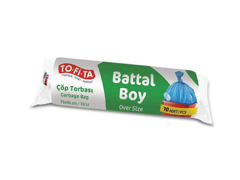 Tofita Çöp Torbası Battal Boy, ev ve iş yerlerinde kullanıma uygun, dayanıklı büyük boy çöp torbasıdır. 75x90 cm boyutlarıyla çeşitli atıkların güvenli ve pratik şekilde saklanmasını sağlar. 10'lu paketlerle sunularak ekonomik bir temizlik çözümü sunar. Sağlam yapısı, sızıntı yapmadan kullanım kolaylığı sağlar.