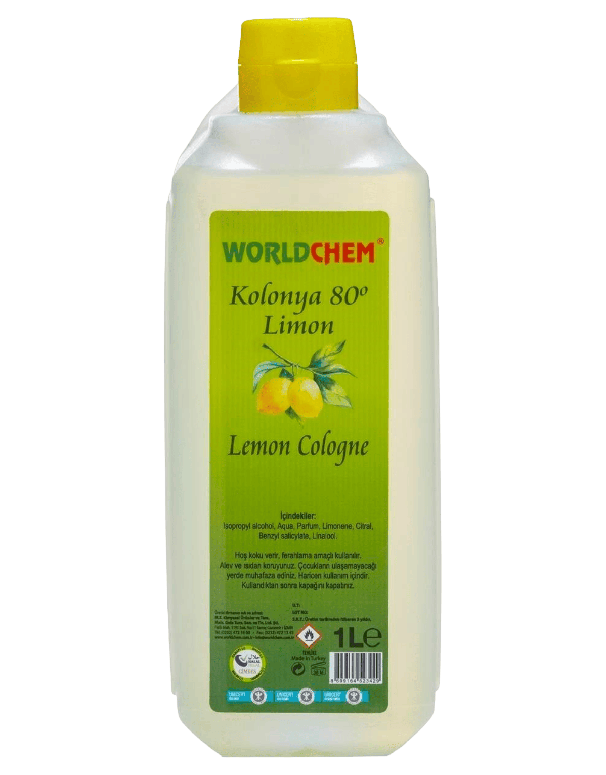 Worldchem Limon Kolonyası, ferahlatıcı limon kokusuyla gün boyu tazelik sunar. 1 litrelik ekonomik boyuyla uzun süreli kullanım sağlar. Temizlik ve hijyen için etkili formülüyle ellerinizi ve ortamınızı arındırır, aynı zamanda serinletici bir etki yaratır. Misafir karşılamalarında, iş yerlerinde ve günlük kullanımda güvenle tercih edebilirsiniz.